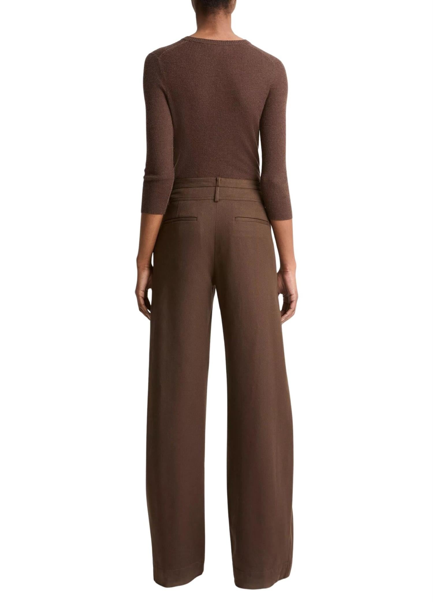 Bukse til dame fra Vince. Vid bukse med en flatterende passform i midjen. Laget i myk bomullstwill med en børstet innside som føles behagelig mot huden. Subtile, funksjonelle detaljer gir et moderne preg, mens den doble linningen gjør det enkelt å style med både smale og brede belter.
