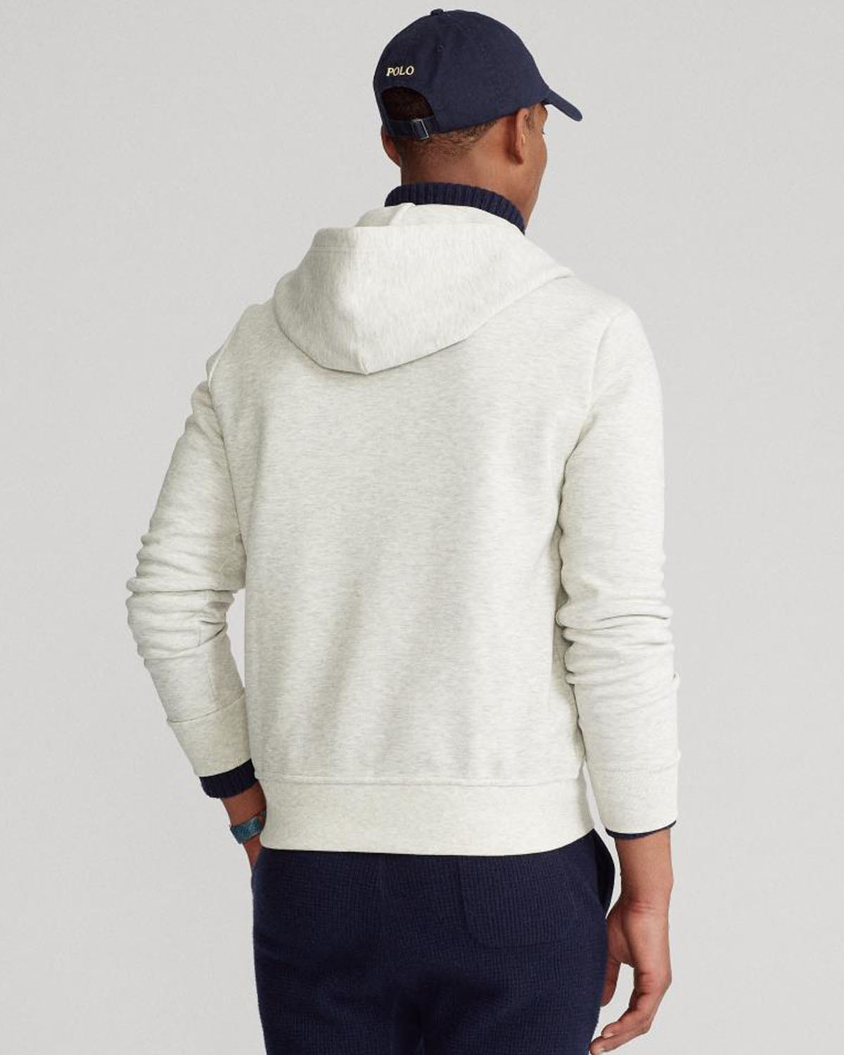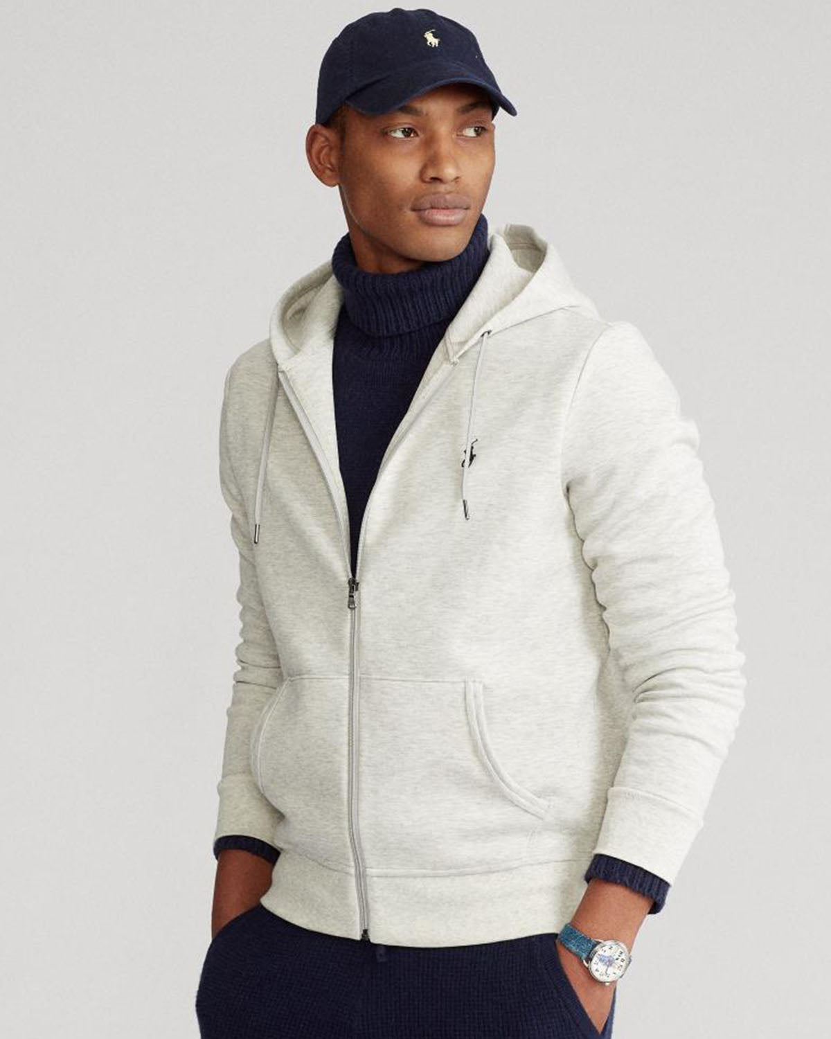 Grå hettegenser med glidelås i myk bomull fra Polo Ralph Lauren. Double-Knit Full-Zip Hoodie har praktiske lommer foran og fullføres av den velkjente polospilleren brodert på brystet.