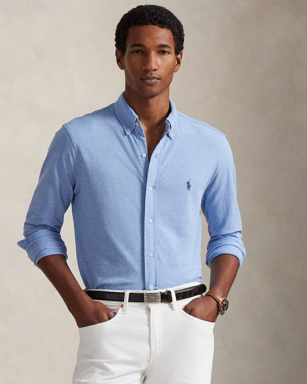 Størrelse medium har en lengde foran på kroppen på 76 cm, en lengde bak på kroppen på 89 cm, en skulderlengde på 48 cm, en brystlengde på 102 cm og en ermelengde på 89 cm. Ermelengden er tatt fra midten bak i nakken. Krage med knapper. Knappestolpe. Lange ermer med knappede mansjetter. Splitt bakpå med boksfold sikrer en komfortabel passform og større bevegelsesfrihet. Brodert ponnilogo på venstre bryst.