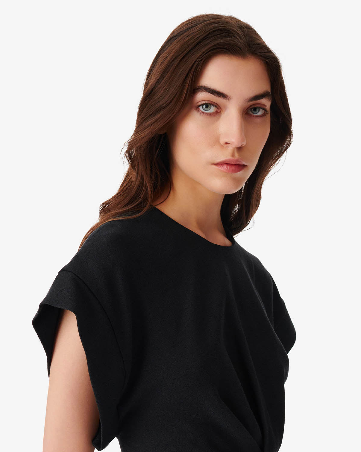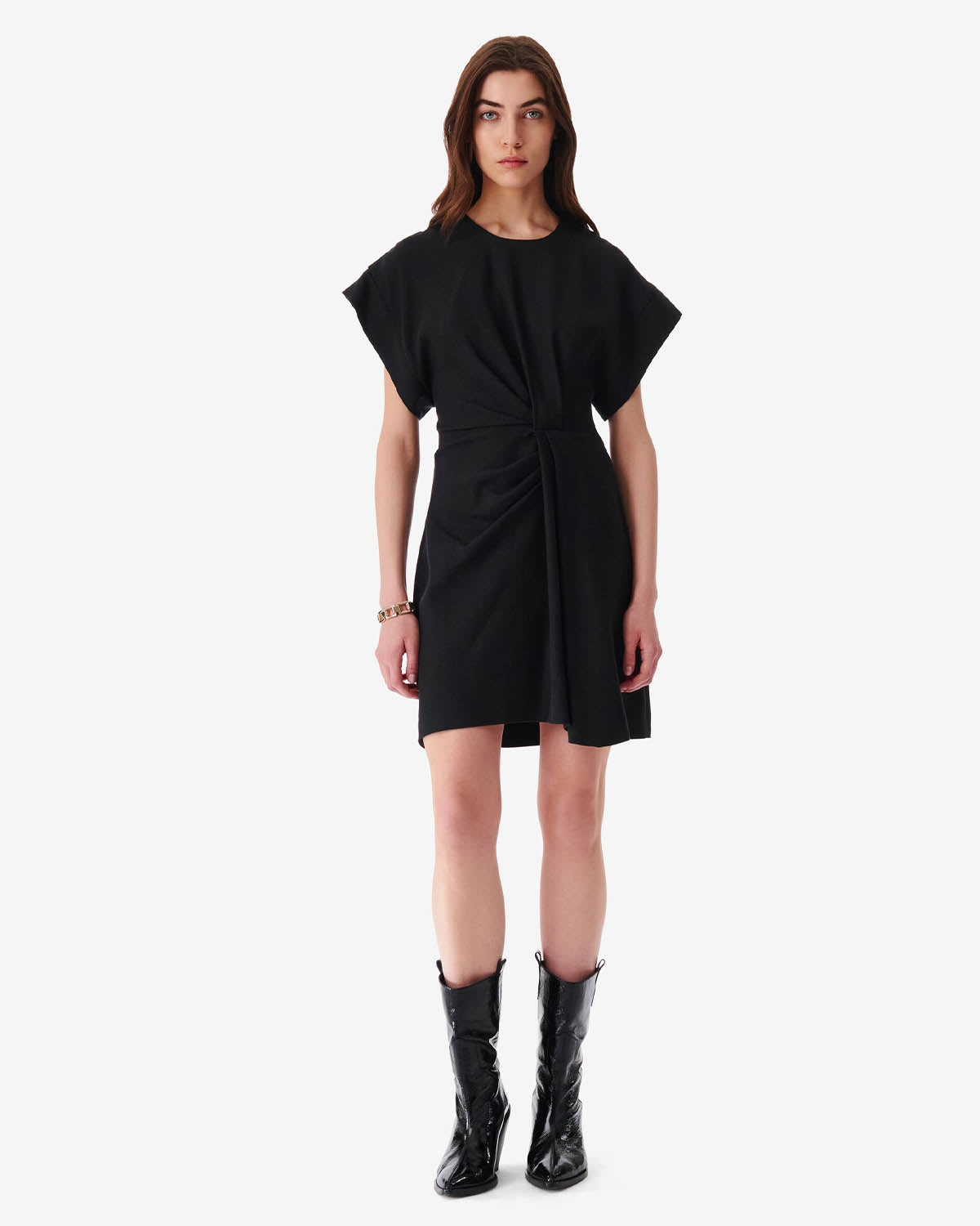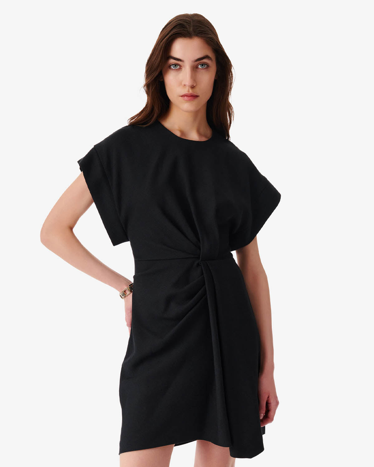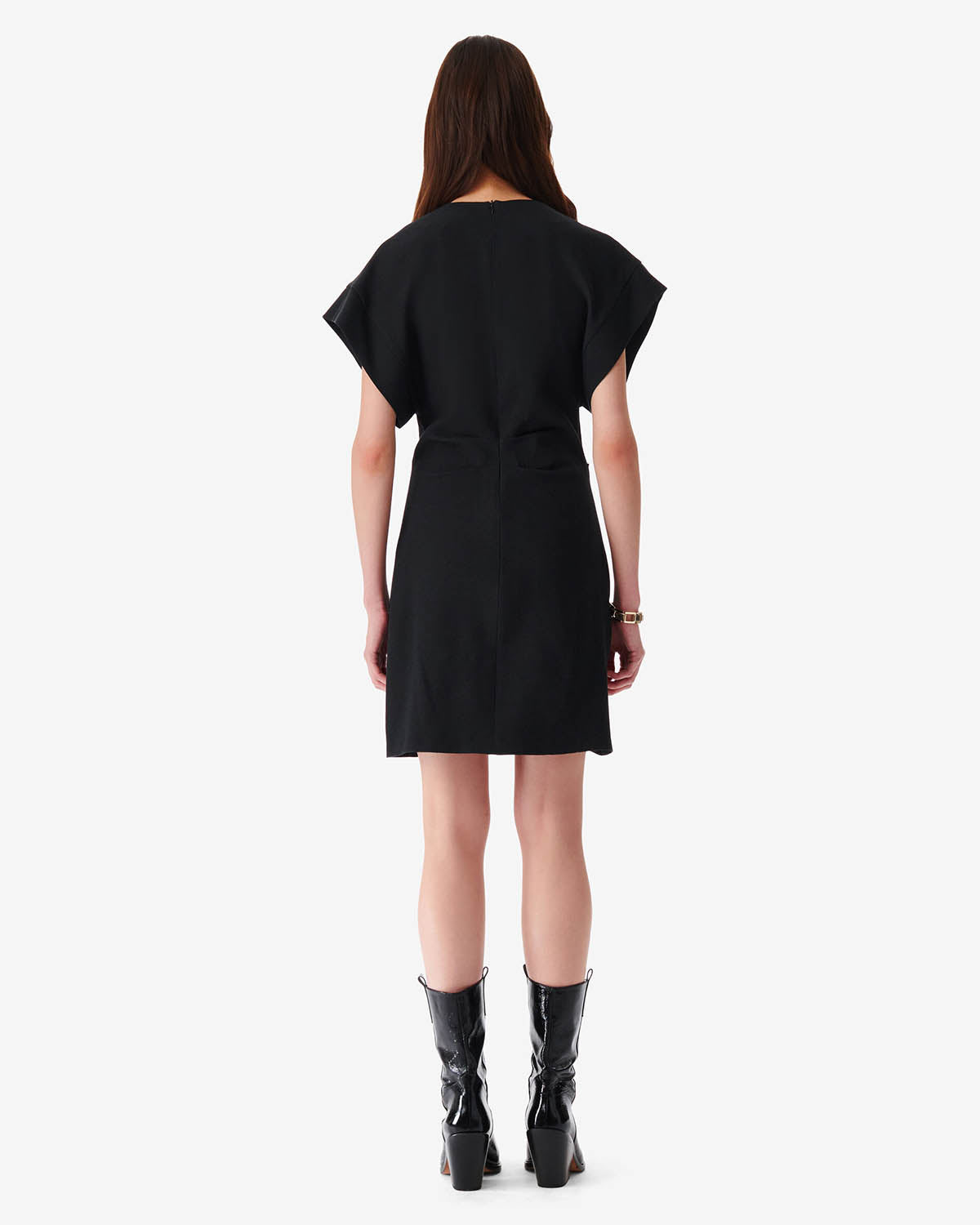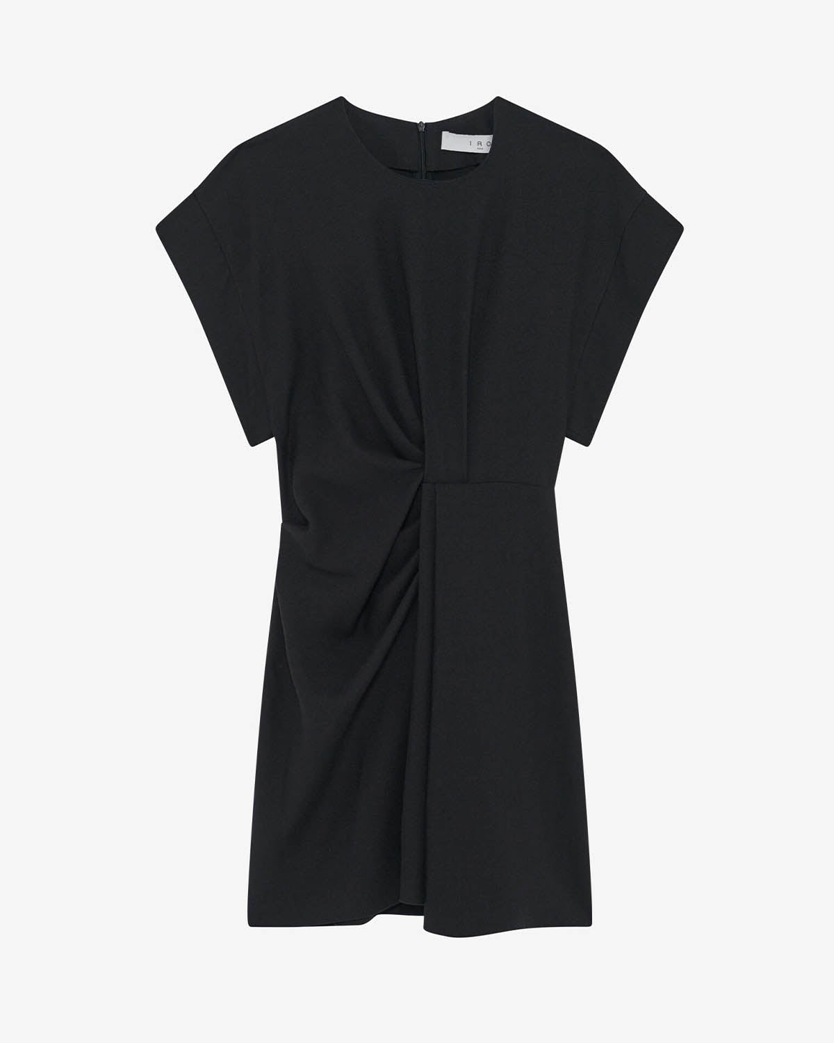 Kort, sort kjole fra Iro. Pena har en rund hals og glidelås på baksiden, samt rynk og volangdetaljer foran