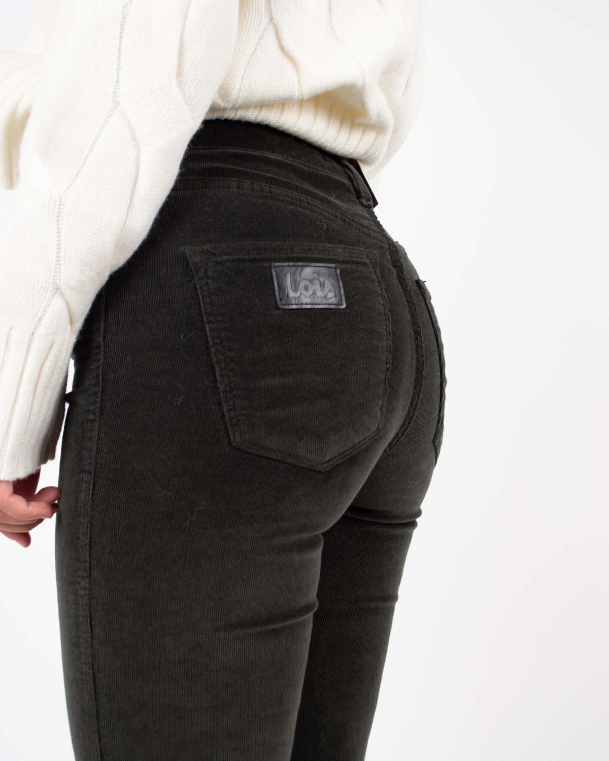Mørk grønn bukse i kordfløyel fra Lois Jeans! Malena F Shiny Micro Rosin er en tøff bukse i myk kvalitet med behagelig stretch. Buksa har høyt liv, smale ben med sleng nederst og en cropped lengde, to lommer bak, lommer i sidene, beltehemper i linning og logodetlajer bak. Like fin til gensere og boots i hverdagen som til en bluse og hæler i penere anledninger!