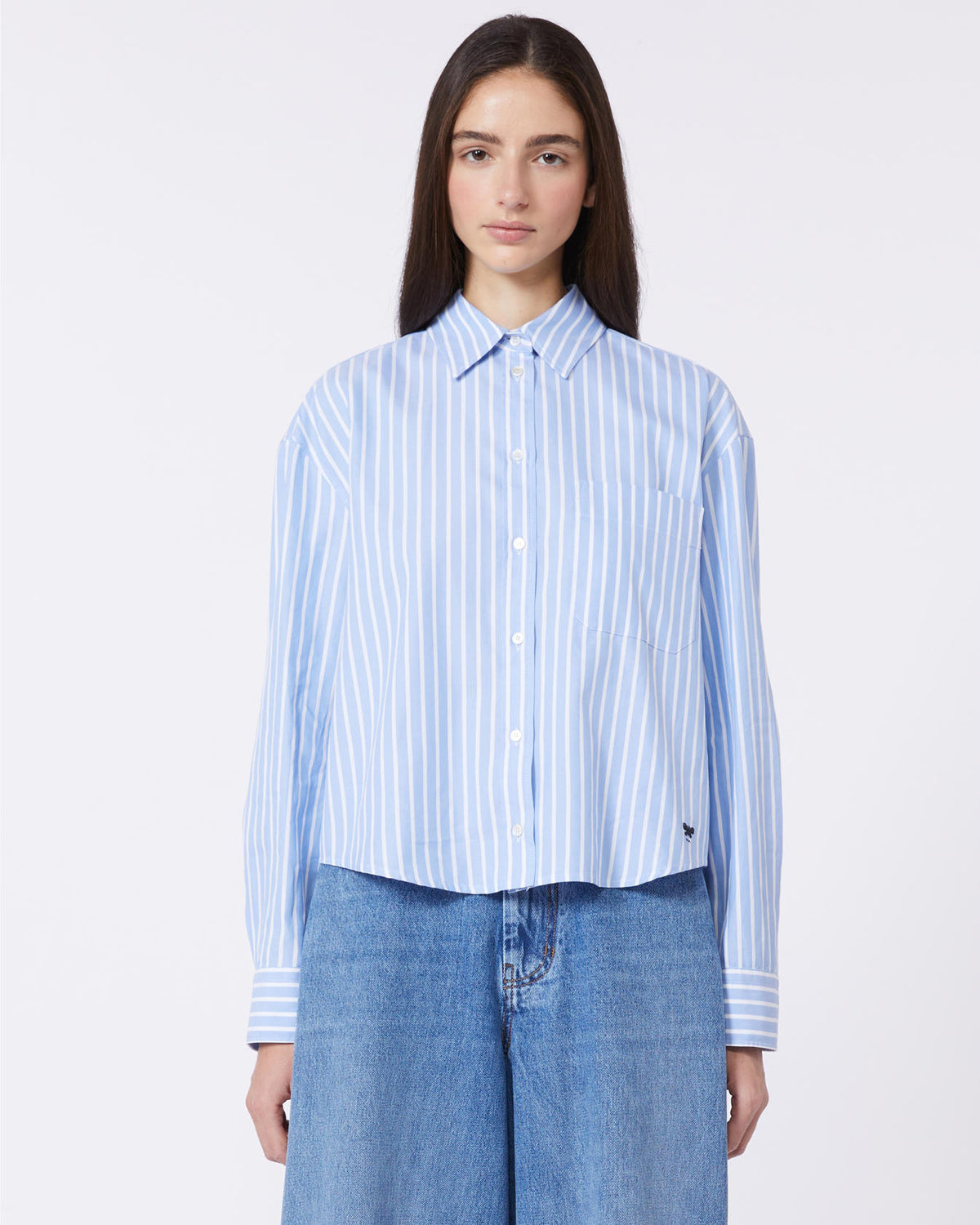Klassisk firkantet skjorte med lange ermer, senkede skuldre og en påsydd lomme på venstre bryst.
