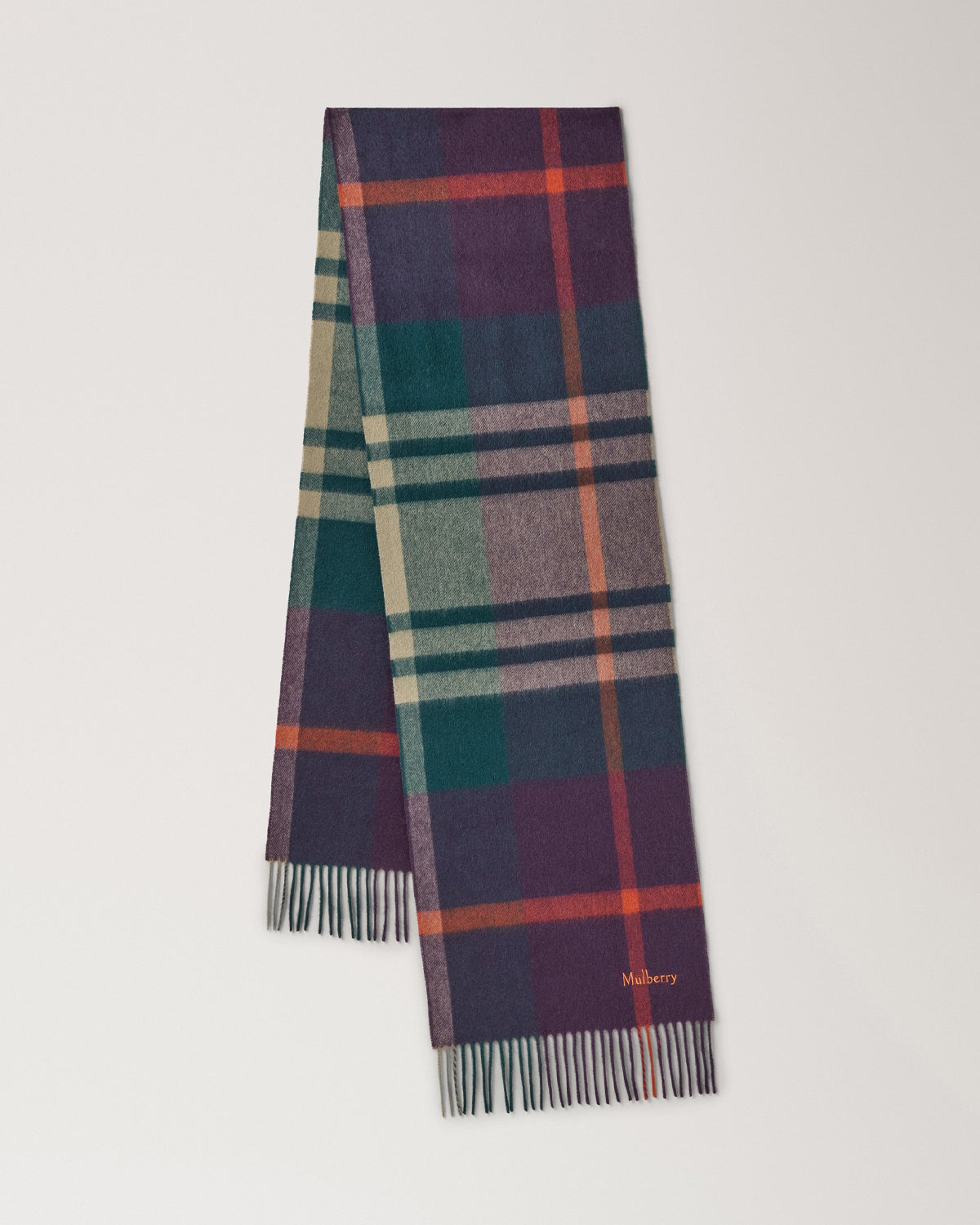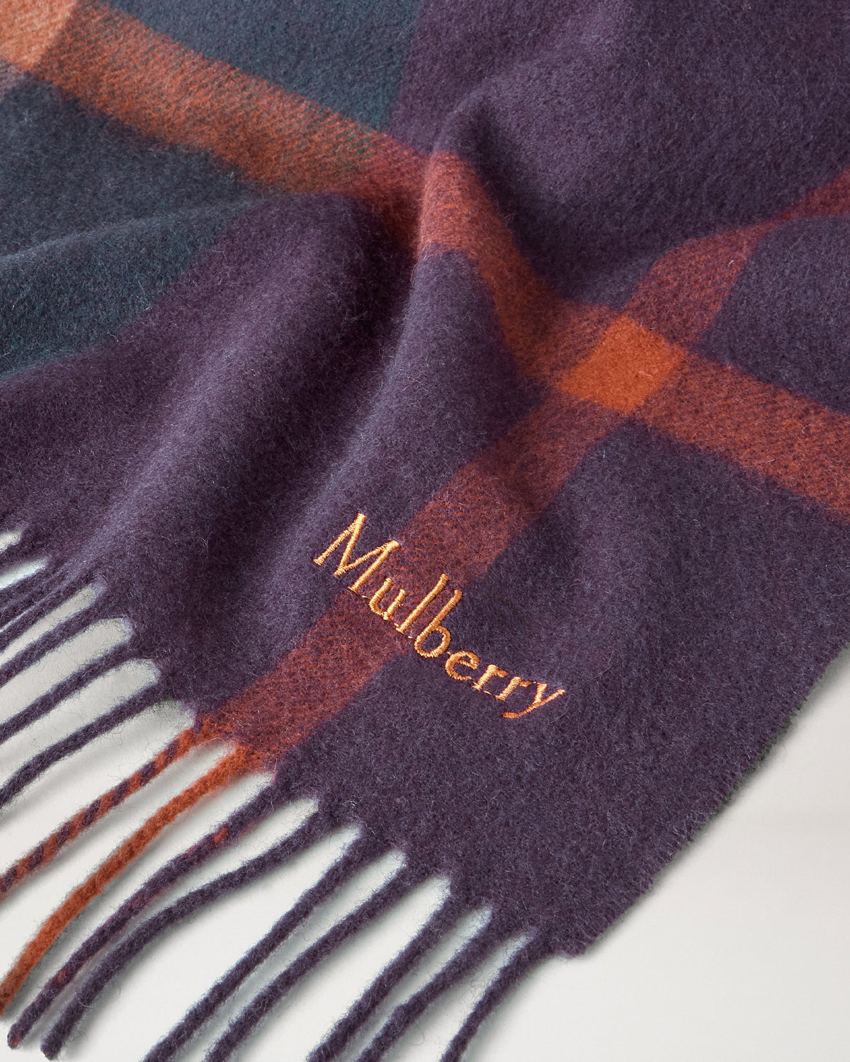 Et klassisk vevd rutete skjerf laget i Storbritannia av 100 % merinoull, med frynser og en brodert Mulberry-signatur.