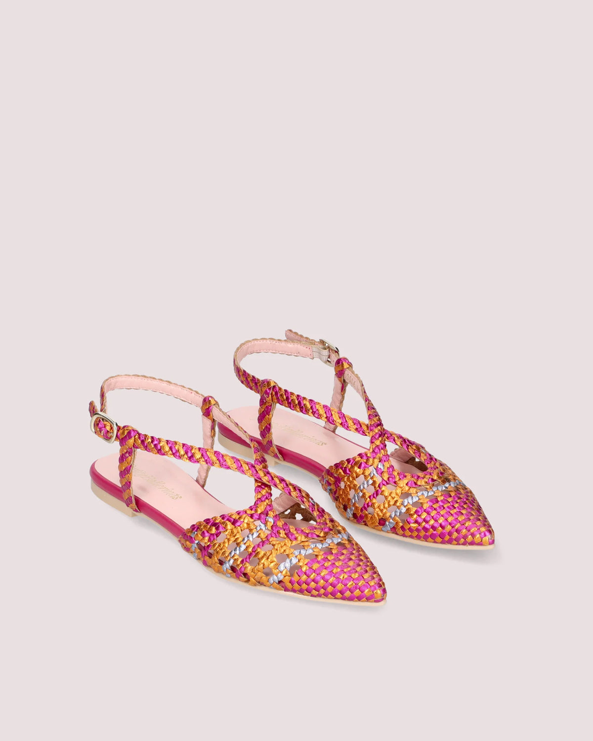 Ella ballerina omdefinerer moderne stil med sin elegant skulpturerte spisse tå og luksuriøse polstrede skinninnersåle. En perfekt blanding av sofistikert design og eksepsjonell komfort, noe som gjør hvert skritt til et ekte moteuttrykk. Denne versjonen presenteres med åpen rygg i flerfarget vevd skinn med gummisåle, skinninnersåle og fôr.