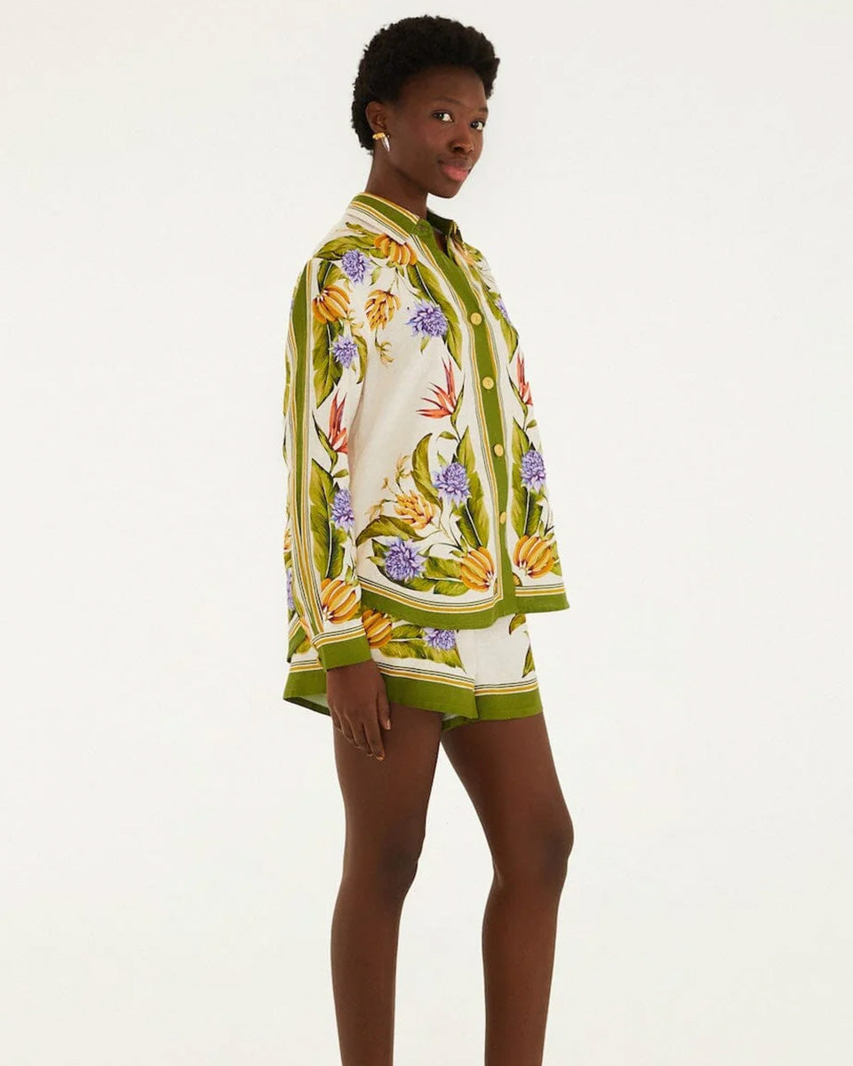 Gå inn i en uanstrengt sommerstil med Sand Tropical Scarf Shorts fra FARM Rio. Laget av en myk blanding av Lenzing™ Ecovero™ og Euroflax™, har disse luftige shortsene en avslappet silhuett som smigrer alle former. Det tropisk-inspirerte skjerftrykket brister med sandfarger og nøytrale bladgrønnsaker, og fremkaller varme strandeventyr. Lette og pustende, de gir et lekent, men sofistikert preg til din solfylte garderobe.