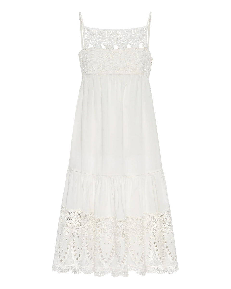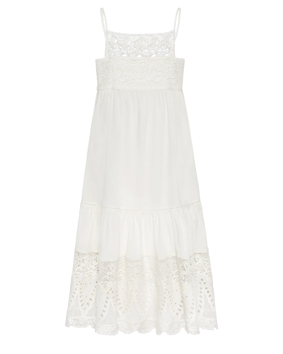 Allora er en myk bomullskjole definert av delikate blondeinnsatser og en luftig, flagrende silhuett. Designet med fine stropper og en mykt rynket form, faller den uanstrengt over kroppen. De intrikate blondedetaljene gir kjolen og vintage-inspirert preg, som gir en romantisk og tidløs følelse. Lett, feminin og enkel å ha på seg, Allora er laget for dager varme og lange sommerkvelder.
