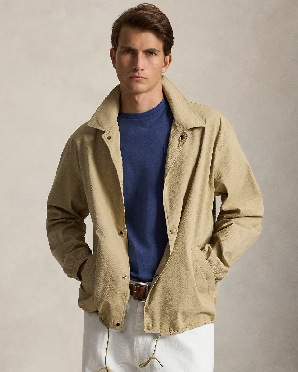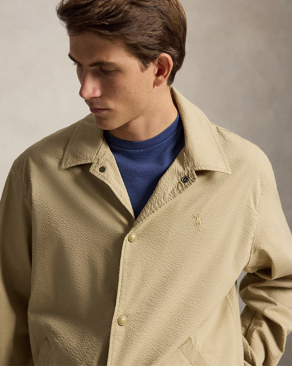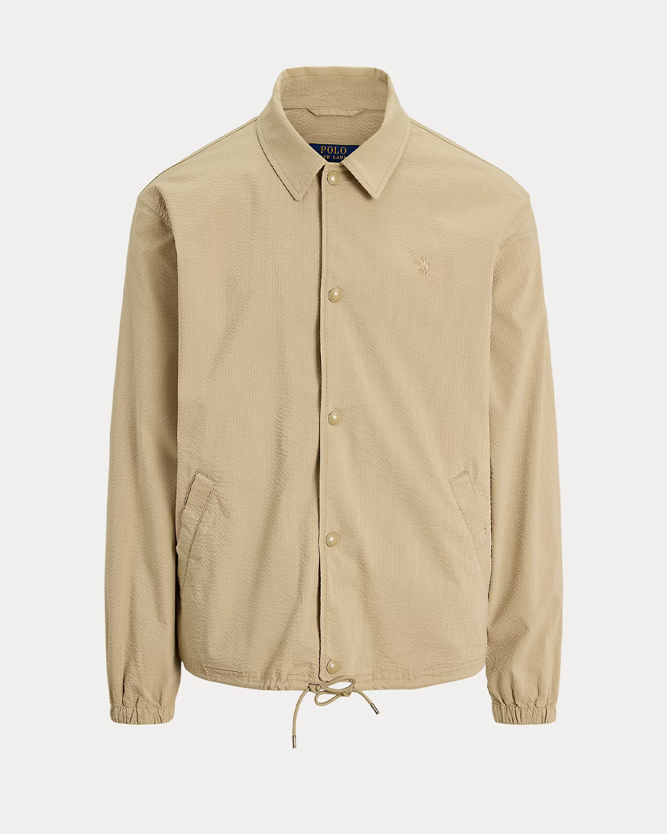 Dette lette laget forener silhuetten til en trenerjakke med et stretch seersucker-stoff som brukes i våre RLX-sportsklær for moderne stil med funksjonalitet.