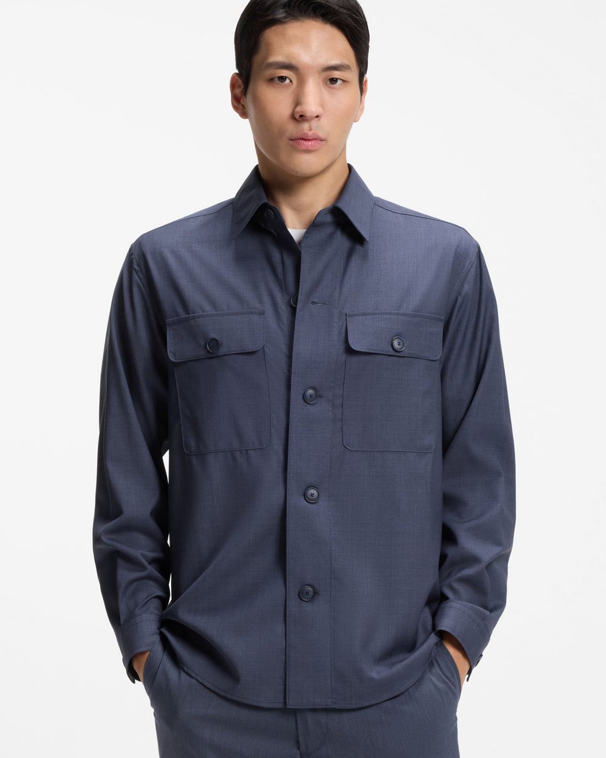 Avslappet passform Slag med hakk Lukking øverst: Knappelukking Antall knapper: 4 eller flere knapper Påsydde brystlommer Knappemansjetter Uforet