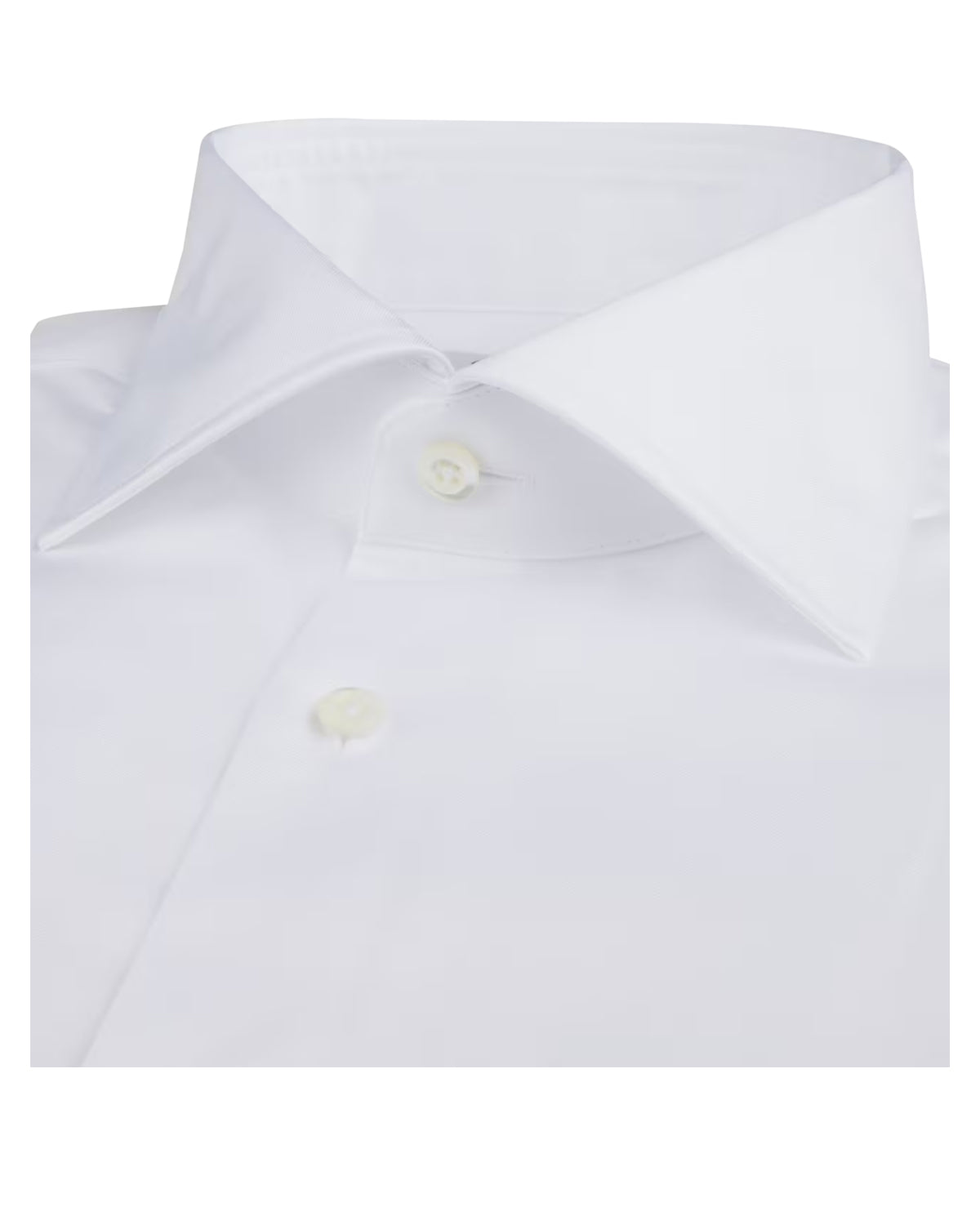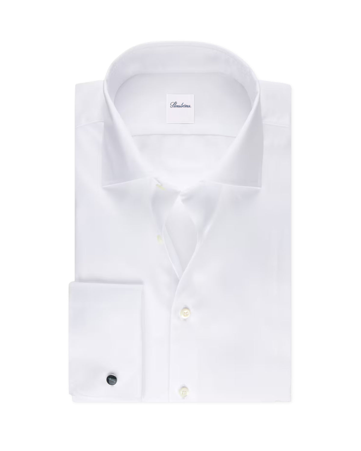 Denne twillskjorten er laget av twofold bomull og har perlemorsknapper, franske mansjetter og en cut away-krage.