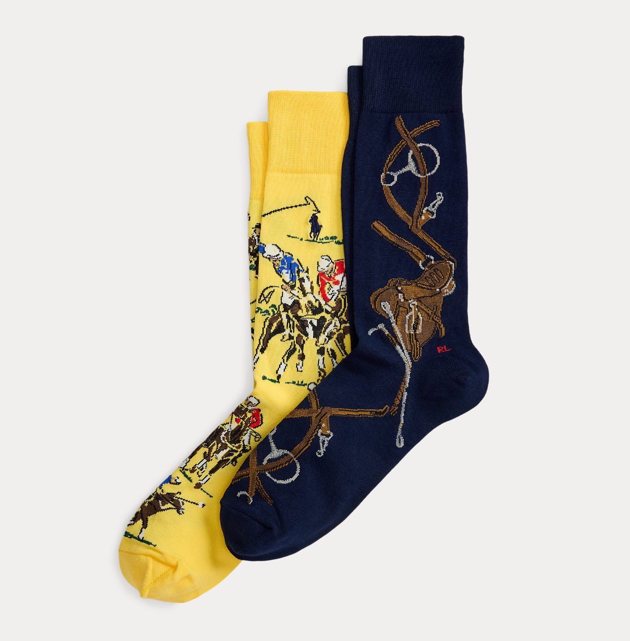 Signaturgrafikk gir denne buksesokken to-pakningen et arv-inspirert rideutseende. Det ene paret er strikket med scener av en polokamp, mens det andre paret har sal-, hodelag- og stigbøylemotiver.