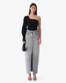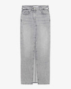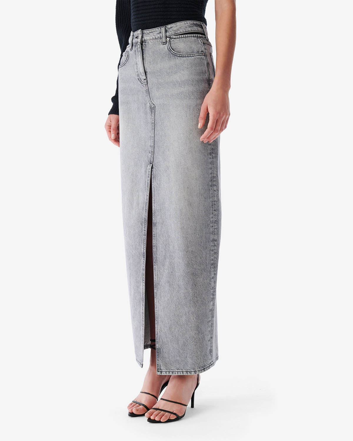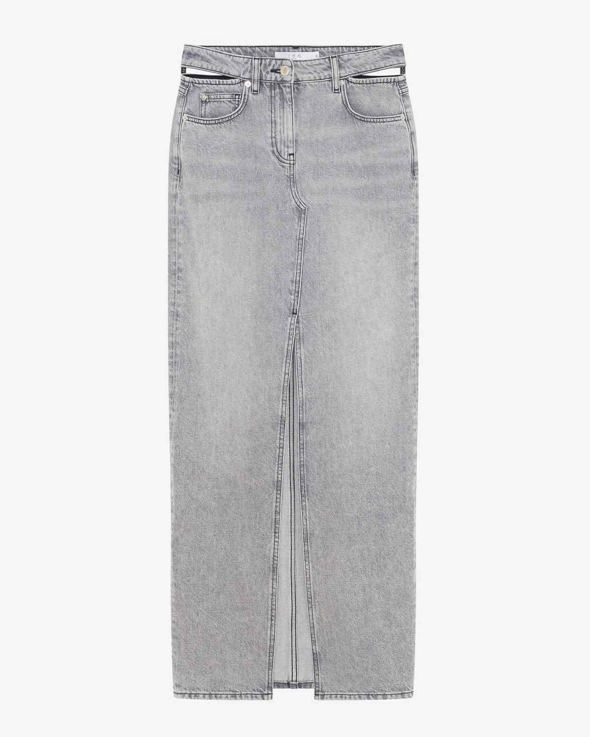 Grått midiskjørt i denim fra Iro. Finji Skirt har et rett snitt med splitt foran.
