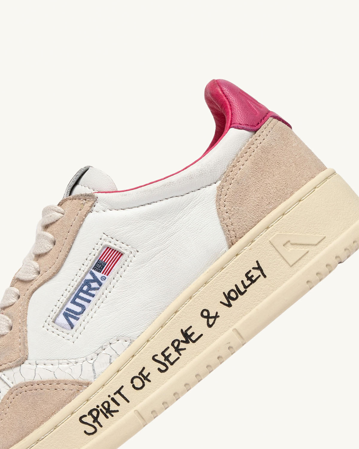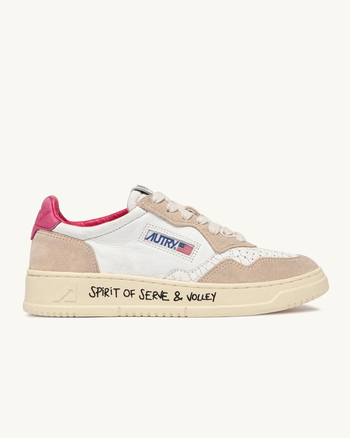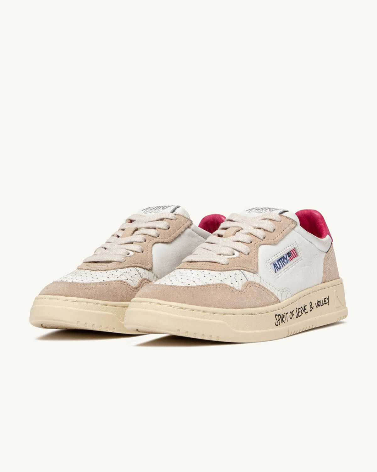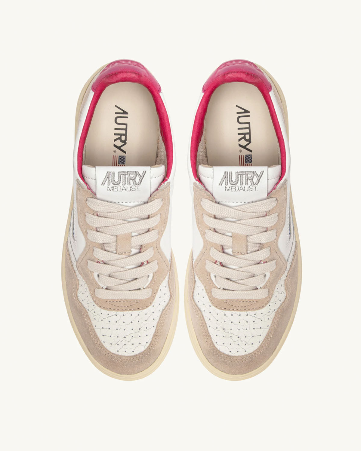Hvite sneakers fra Autry. Medalist Low wom er inspirert av vintagedesignet fra 80-tallet, med en moderen vri. Et særegent design gjort unikt av overdelen i hvitt skinn med beige semsket skinn og den ikoniske logoen preget på en rosa rygglapp.