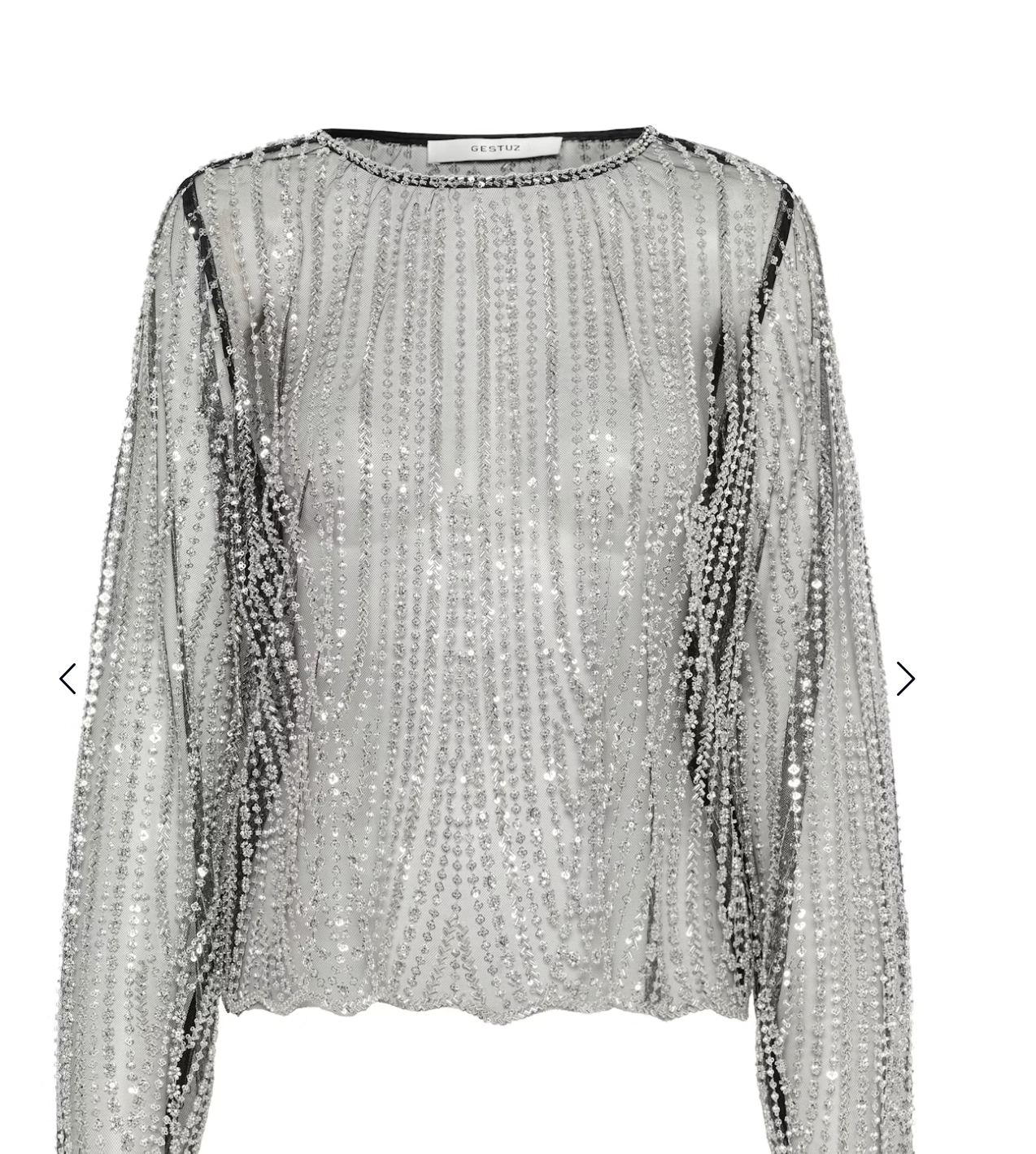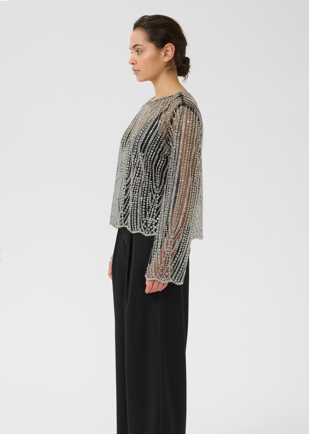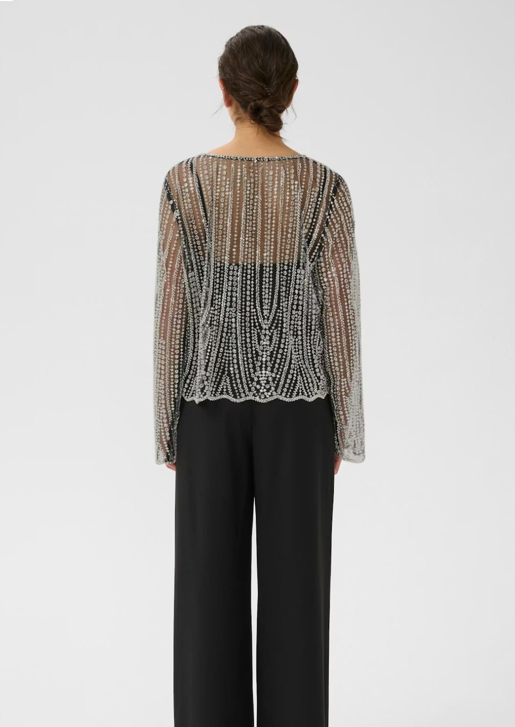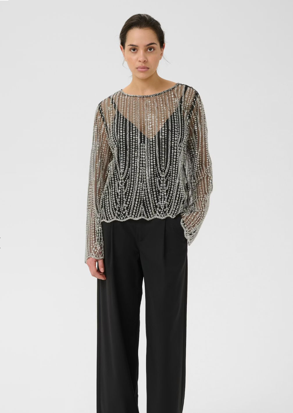 Bluse i transparent mesh med rett passform. Dekorert med vertikale perler som gir et elegant og glitrende uttrykk. Modellen er 175 cm høy og har på seg størrelse S/36.