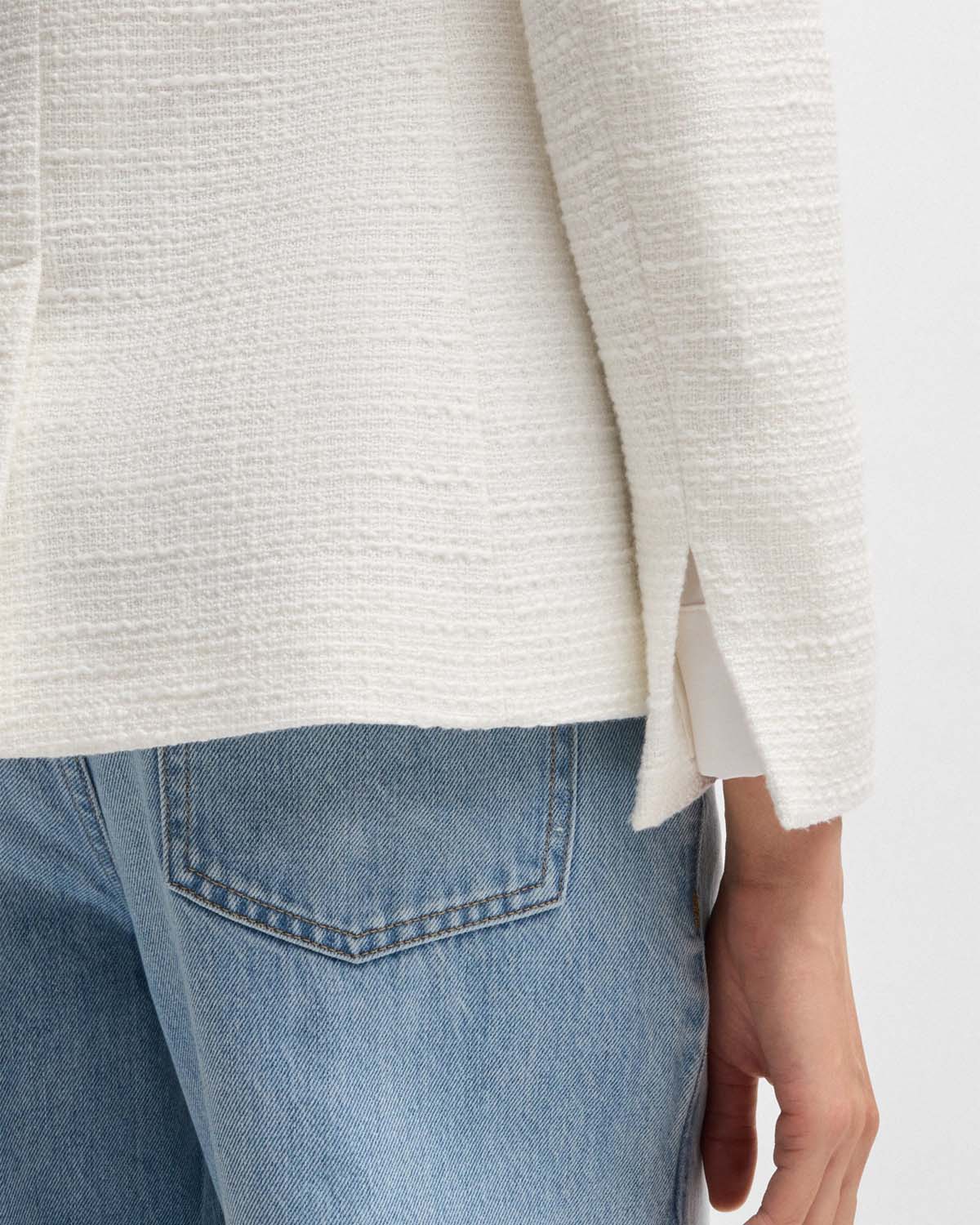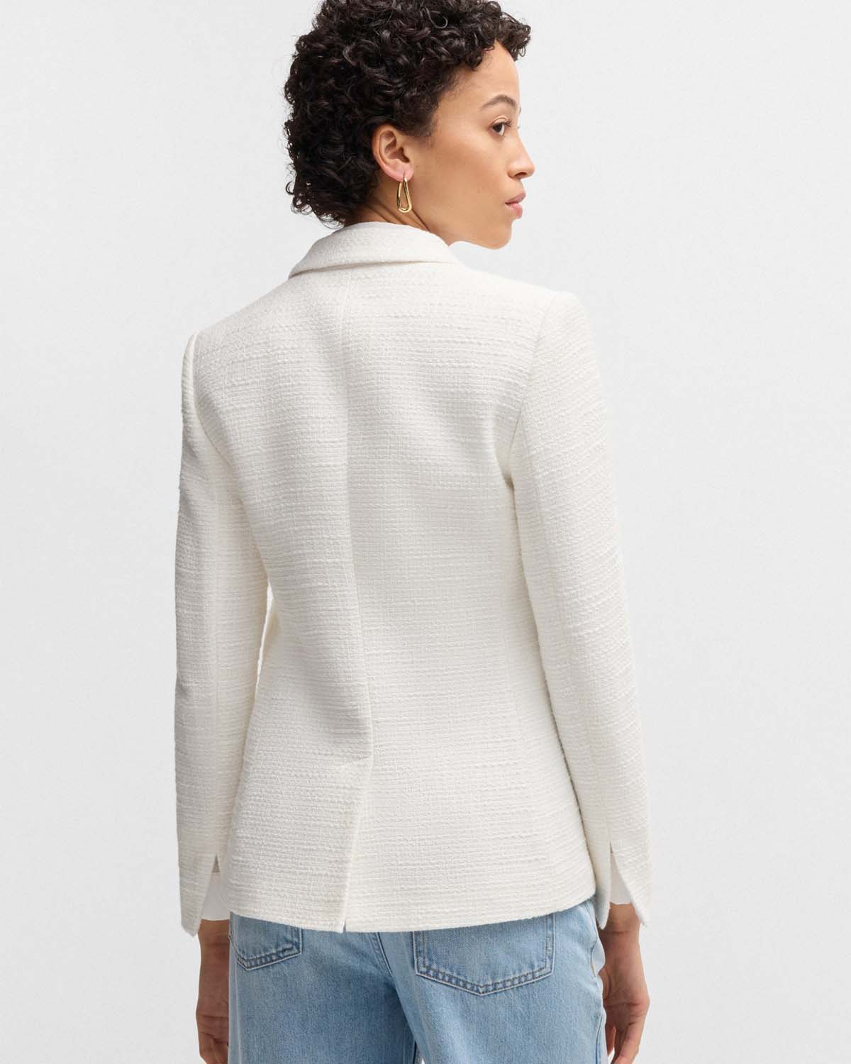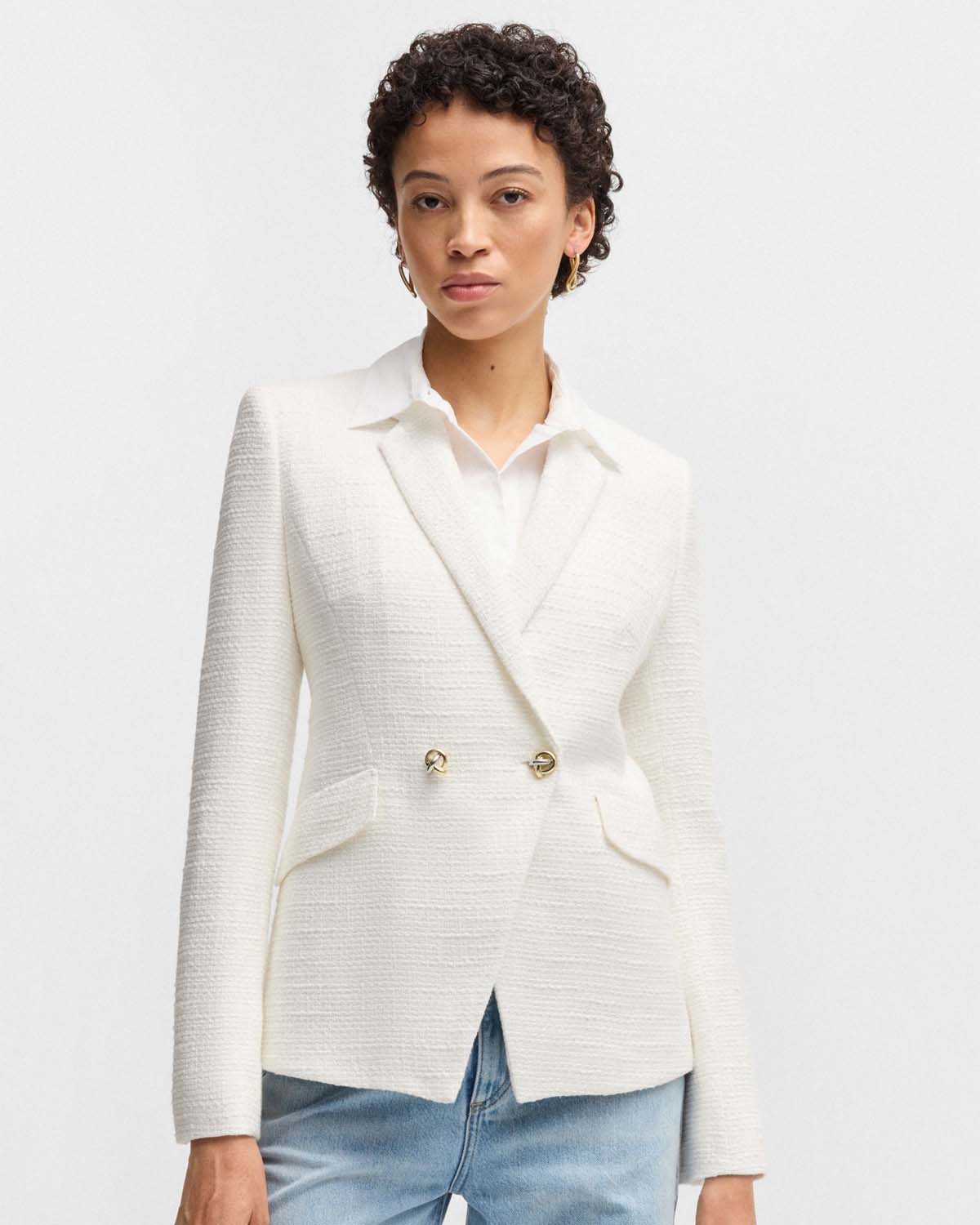 Denne dobbeltsnappede BOSS Womenswear-blazeren er en tidløs investering i rikt tweed for et klassisk utseende. Ren slim passform. Gulltone knuteknapper.