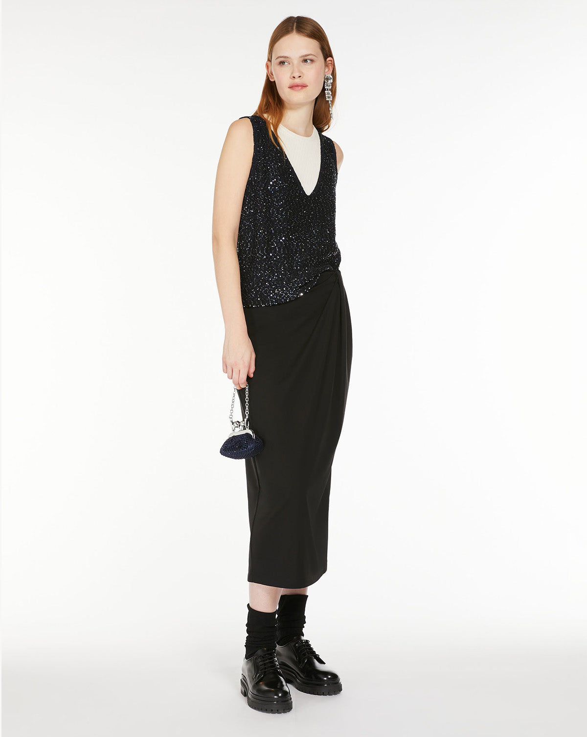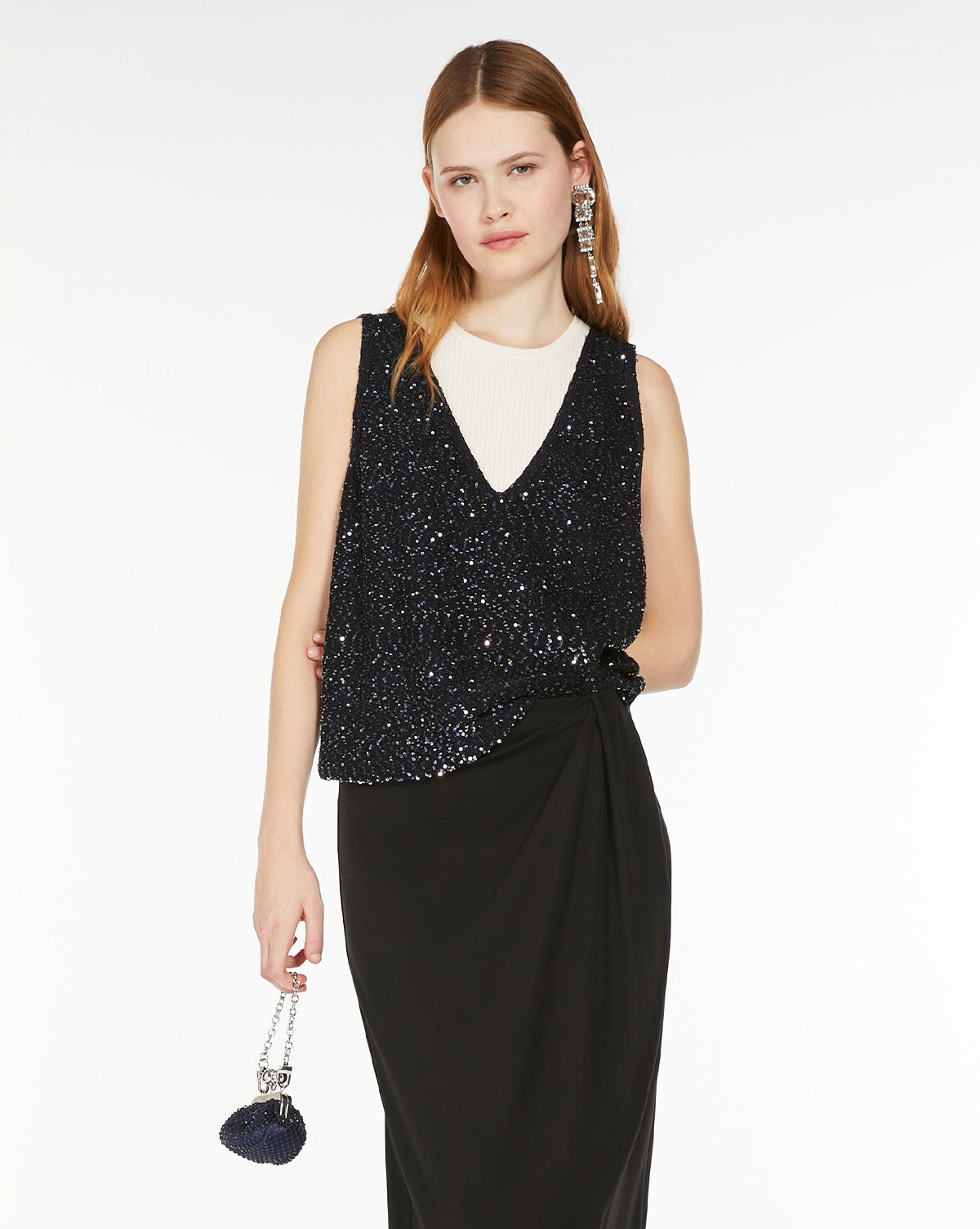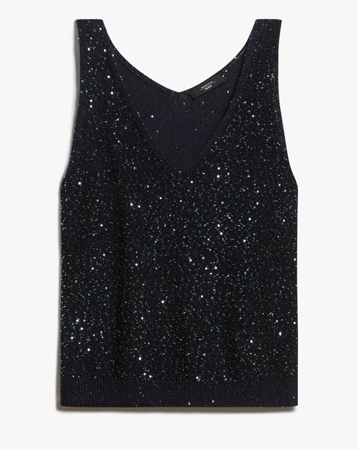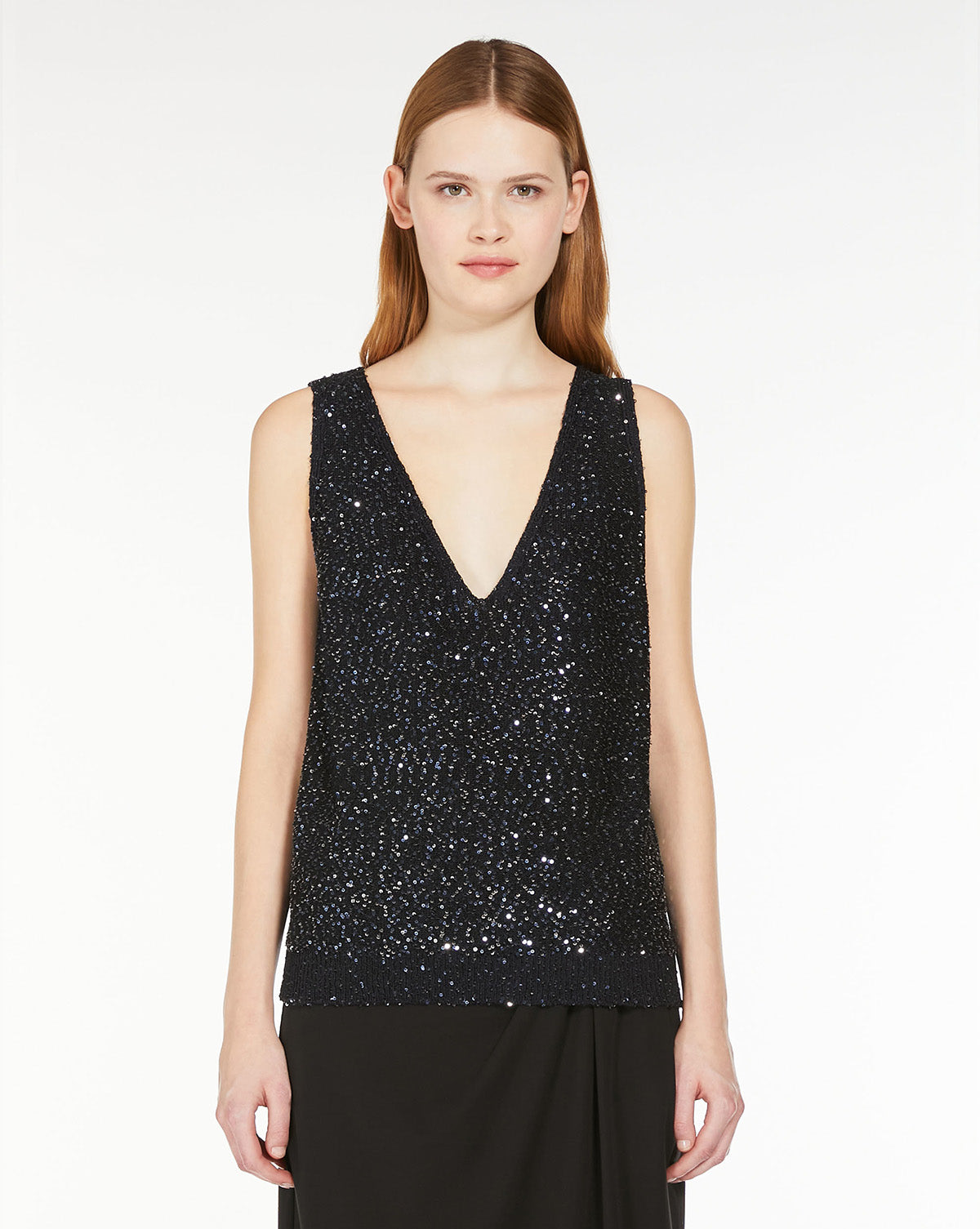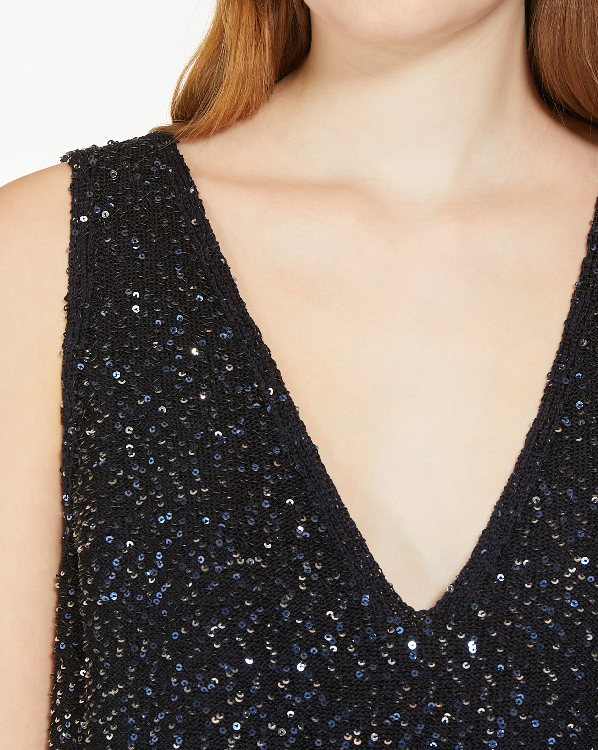Topp med avslappet passform i strikket stoff med brodert mikropaljetter. Modellen med standard lengde har ribbestrikkede kanter, i tillegg til V-hals foran og bak.